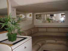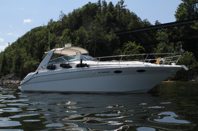 This is the "Aqua Hilton"...my 1998 Sea Ray Sundancer 370. Registered at 37 feet, 3 inches and a LOA of 41 feet. It is equipped with 2X Mercruiser Horizon 7.3L V8's, a generator, 2 A/C units (brrrrr!), Radar, GPS, 2 TV/VCR combos, 2 fridges (for the ice tea!) sleeps 6 and takes 1200 litres of fuel!!!